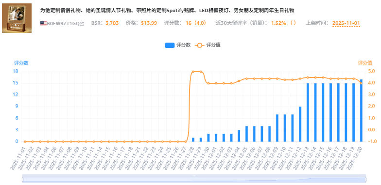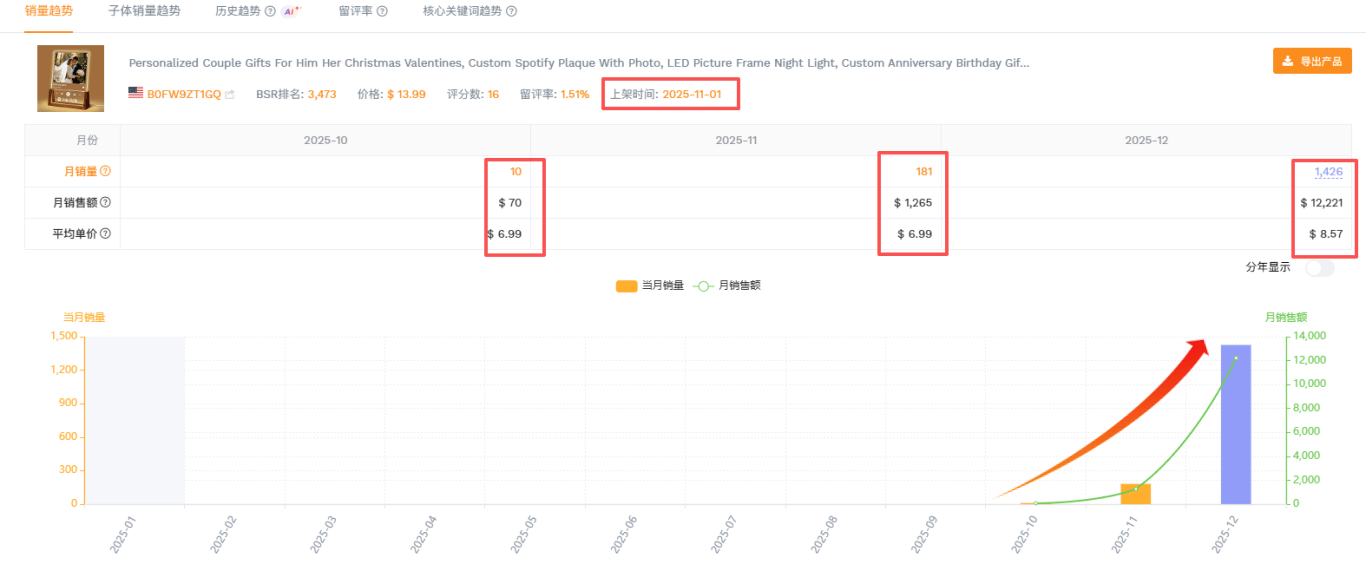 卖家精灵显示,这款 Personalized Couple Gifts Night Light 在美国站点近期表现不俗,上架48天,当月销量不到200单,却在十二月份销量飙升至1400单以上,小类目排名#186,热度明显提升。