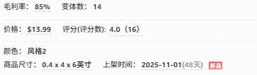 当前店铺售价为13.99美元,85%的毛利率算下来成本大概在2美金,市场定价在8~15美元,定价没有出现两级分化。