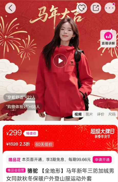 而且一件也能立减,对于想省心又想省钱的消费者来说,无疑是个不错的选择。例如,骆驼马年三防加绒款的运动外套,原价1328,如今仅需299就能到手,相当于打了2.3折,很受年轻人的欢迎。省下的预算和精力,正好可以去挑挑其他设计独特的马年好物。
