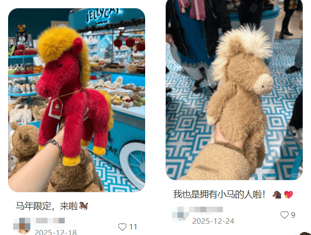 不只是珠宝,连故宫文创也出了萌萌的“跃马送福”冰箱贴,网红玩具品牌Jellycat的毛绒小马更是成了治愈系年货。甚至很多地毯、抱枕上的马图案,也都是圆滚滚的。看得出来,大家想沾的不是“一马当先”的紧张感,而是“马上快乐”的松弛和福气。