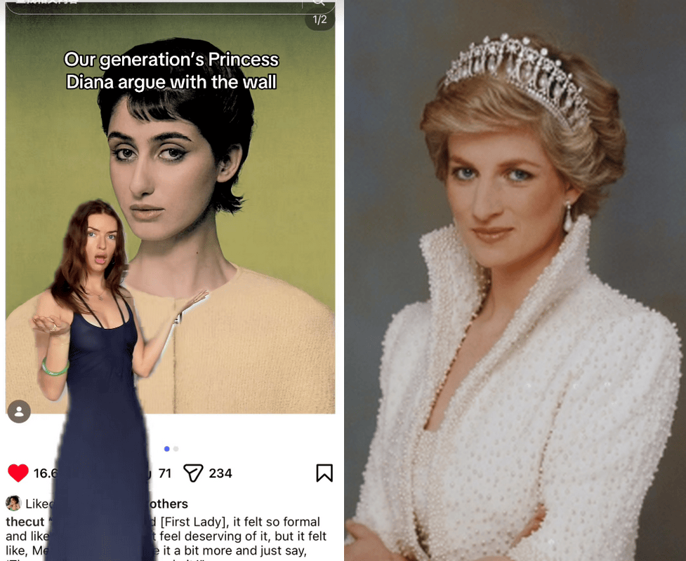 比如在Tik Tok上,拉玛就被称为“新世代的戴安娜王妃”。近期拍的大片,有早期王室肖像画的感觉,表情和Pose也很神似。
