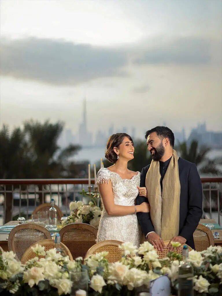 一场是订婚宴,地点选在了迪拜的Vida Creek Harbour。佐兰换上剪裁得体的昂贵礼服,拉玛身穿一件饰满珍珠的重工刺绣婚纱,贵气逼人。
