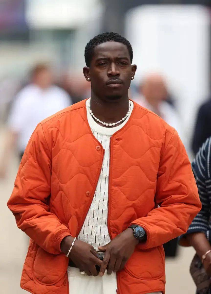 牛仔背心则是Ahluwalia,叠穿白色T恤队服,也要有银链做点缀。感觉他的每套look都要有小配饰的参与。