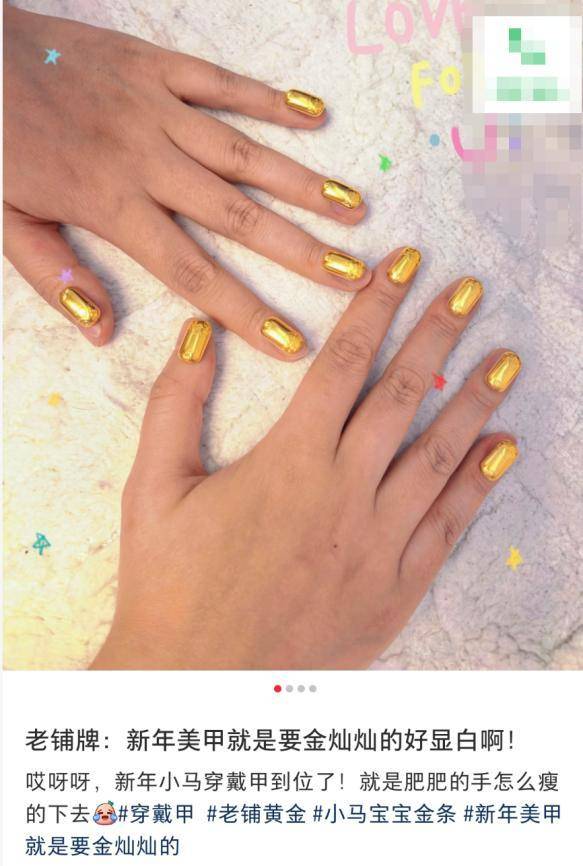 为了追求效果,甚至有网友将老铺黄金的“生肖金条”系列(重量可高达10克)搬上指甲。