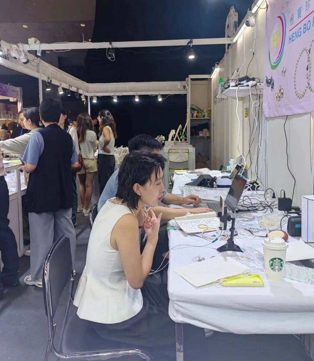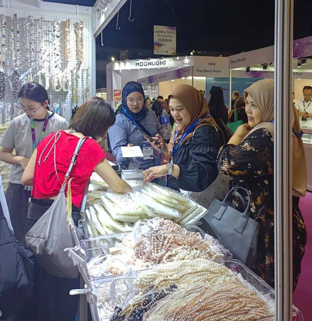 展馆内,来自中国内地、日本、意大利等国家和地区的300余家企业带来各种Akoya珍珠、南洋珠、大溪地珍珠和淡水珠,此外,还有海螺珠和美乐珠等天然海洋珍品,以及相关的珠宝配件,吸引了来自世界各地的买家参观购买。
