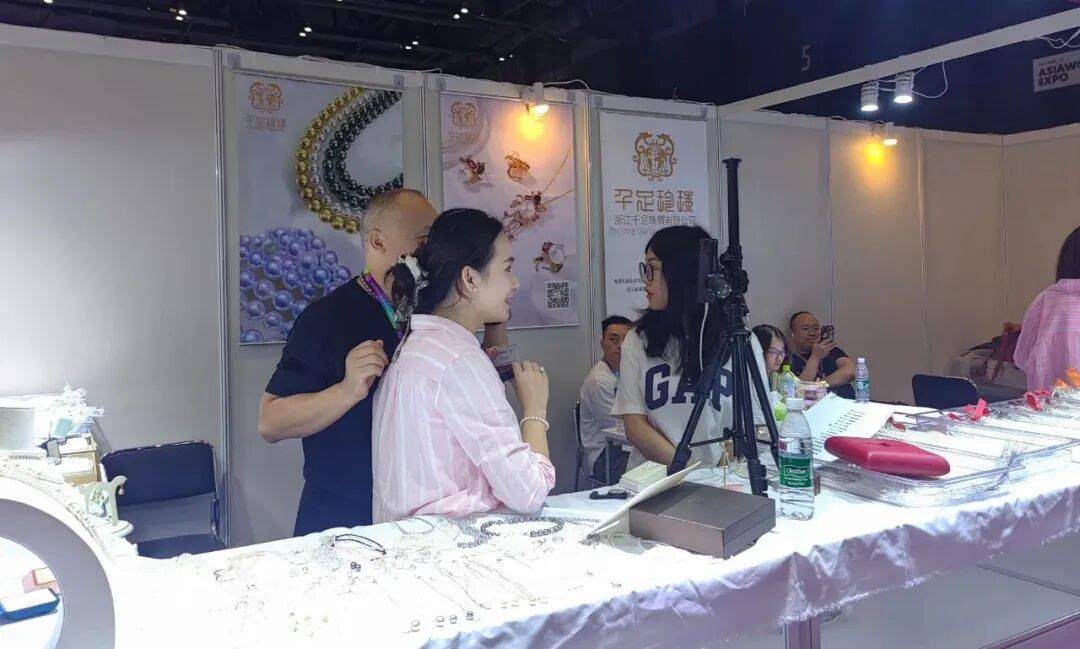 浙江省珍珠行业协会本次有20家多优质会员单位参展,其中包括国内知名珍珠品牌爱迪生珍珠、天使之泪、千足珍珠、天地润等,都带来大量淡水珍珠原材料及部分成品珍珠首饰。其中千足珍珠还进行了现场直播带货。从莹润饱满的顶级无核珠到独具特色的巴洛克珍珠,从古典雅致的传统珠串到时尚前卫的设计款珠宝,世界各地的观众可一站式领略“世界珍珠之都”的全品类魅力。