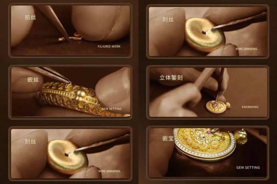 乍一看,其他“三姐妹”的古法金工艺,和老铺并没有太大区别,包括但不限于锤揲、錾刻、珐琅、掐丝、镶嵌、炸珠、垒丝、花丝、镂空雕和修金。每个工艺,都可以拿出来说道一番,成为各件金饰的主打卖点。