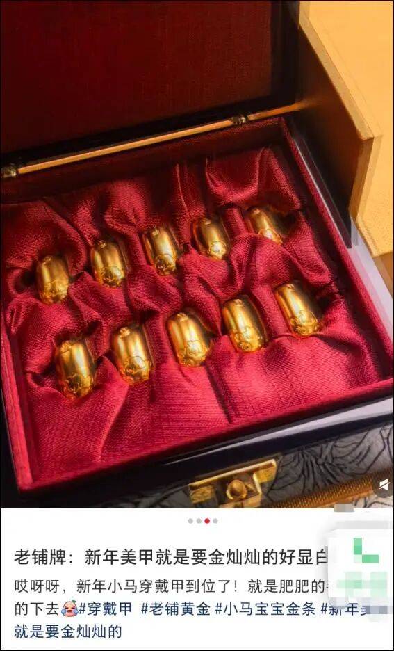 为了追求极致效果,甚至有网友将老铺黄金的“生肖金条”系列(重量可高达10克)搬上指甲。