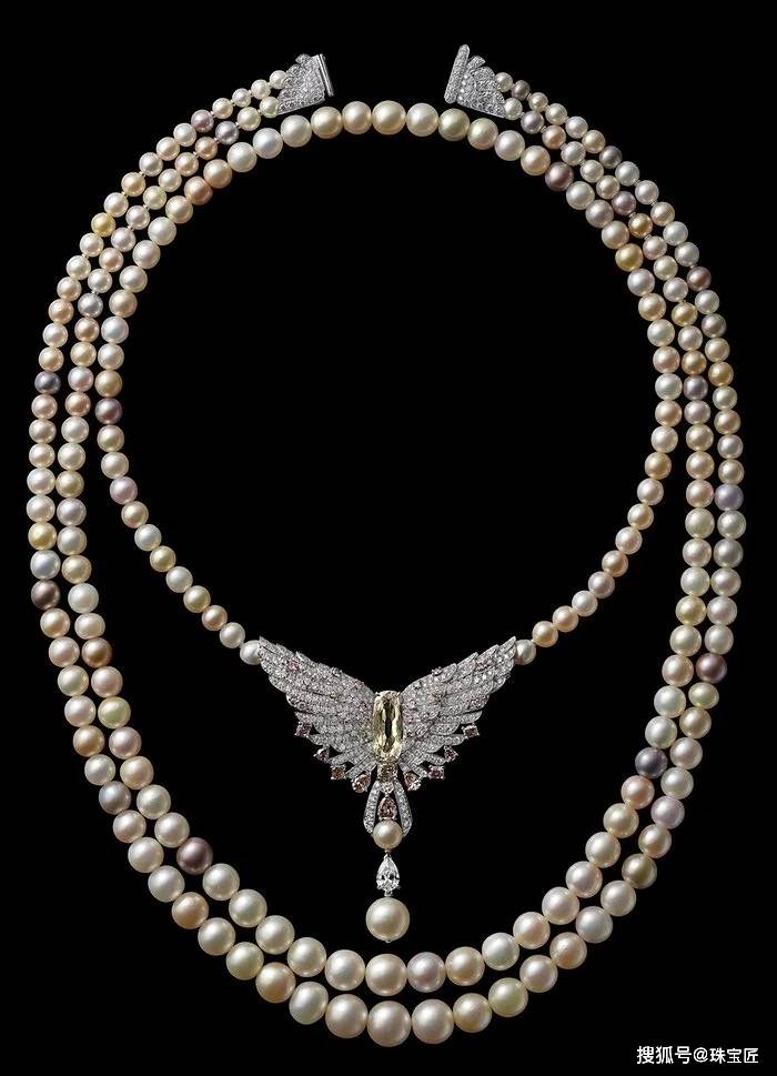 皇家七股天然珍珠钻石垂坠项链,项链由七股珠链组成,共镶嵌614颗渐变天然海水珍珠,于2013年11月佳士得日内瓦专场,以9,081,664美元成交。