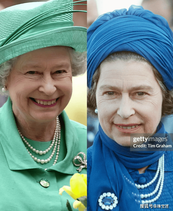 温莎王朝的伊丽莎白二世和这位没有血缘关系的女王前辈心有灵犀,也喜欢多条珍珠项链叠戴。