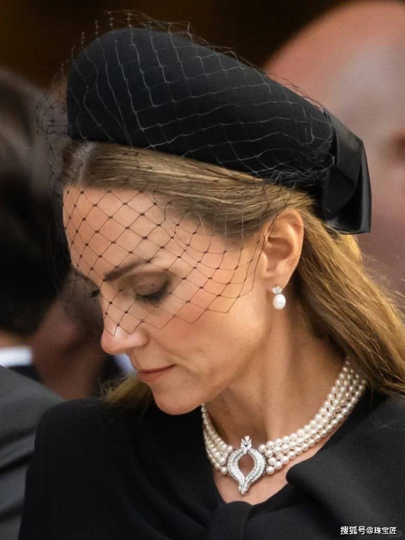 她最具代表性的 “日本四排珍珠项链”,源自1970年代日本政府赠予伊丽莎白二世的国礼,经王室珠宝匠打造后,成为王室女性的传承配饰。