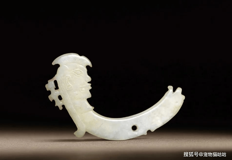 此像以温润白玉雕琢,人物形象神秘庄严,头戴高冠,双目微闭,似在沉思冥想。一端雕刻出一位侧面神人像,戴冠披发,形象生动。其造型独特,线条简练而富有张力。