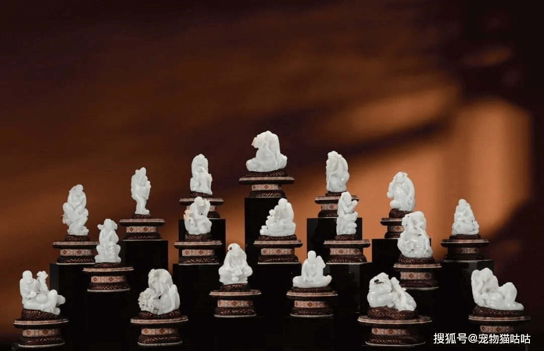 此十八罗汉白玉摆件所用玉材取自同一颗15公斤的新疆和田玉籽料原石,质地洁白细润,油脂光泽,伟德国际官网宝气内敛,每一位罗汉形象都栩栩如生,各具特色。