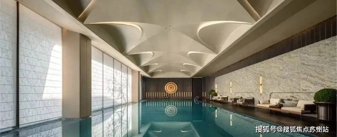 泳池设计以“水韵织构”为核心理念,其视觉焦点在于穹顶,连续流畅的曲面拱顶如同被风吹皱的巨大水幕,又似凝固的海浪,与下方波光粼粼的泳池水面形成上下呼应的绝妙韵律,伟德国际victor1946无边泳池又与琉璃光院在视觉上无缝衔接,在乌桕树的冠盖浓荫下恣意游弋,营造出泳池与天地共呼吸的震撼体验。