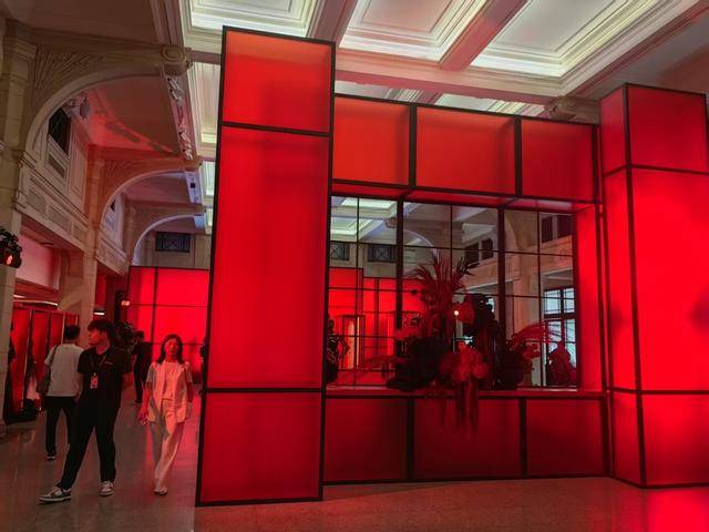 在博物馆里看时装秀,首先映入眼帘的是一片自信的红色。历博一楼以几何形的红色玻璃屏风隔出一个个小型展览空间,摆放品牌往年作品。说起“新中式”,来看秀的上海国际时尚联合会顾问王新元第一个想到的也是这一抹红,“中国文化不只有笔墨和黑白,在色彩表达的厚度、深度和文化延伸上也非常优秀。”