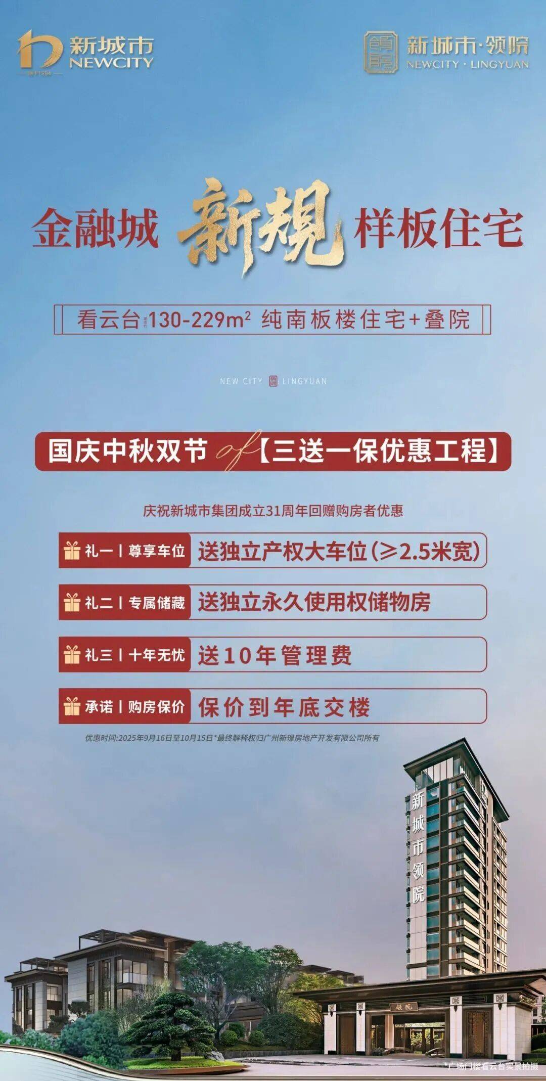 【匠心筑造·31载淬炼的品质承诺】项目由深耕广州31年的新城市集团倾力打造:开发企业:新城市集团(广州房地产行业规范改革倡导者)设计团队:汉森伯盛、普邦园林、纵横设计三大顶尖机构产品定位:金融城芯唯一0.93容积率纯住宅大院建筑规格:16层小高层+4-5层叠院,68席传世藏品